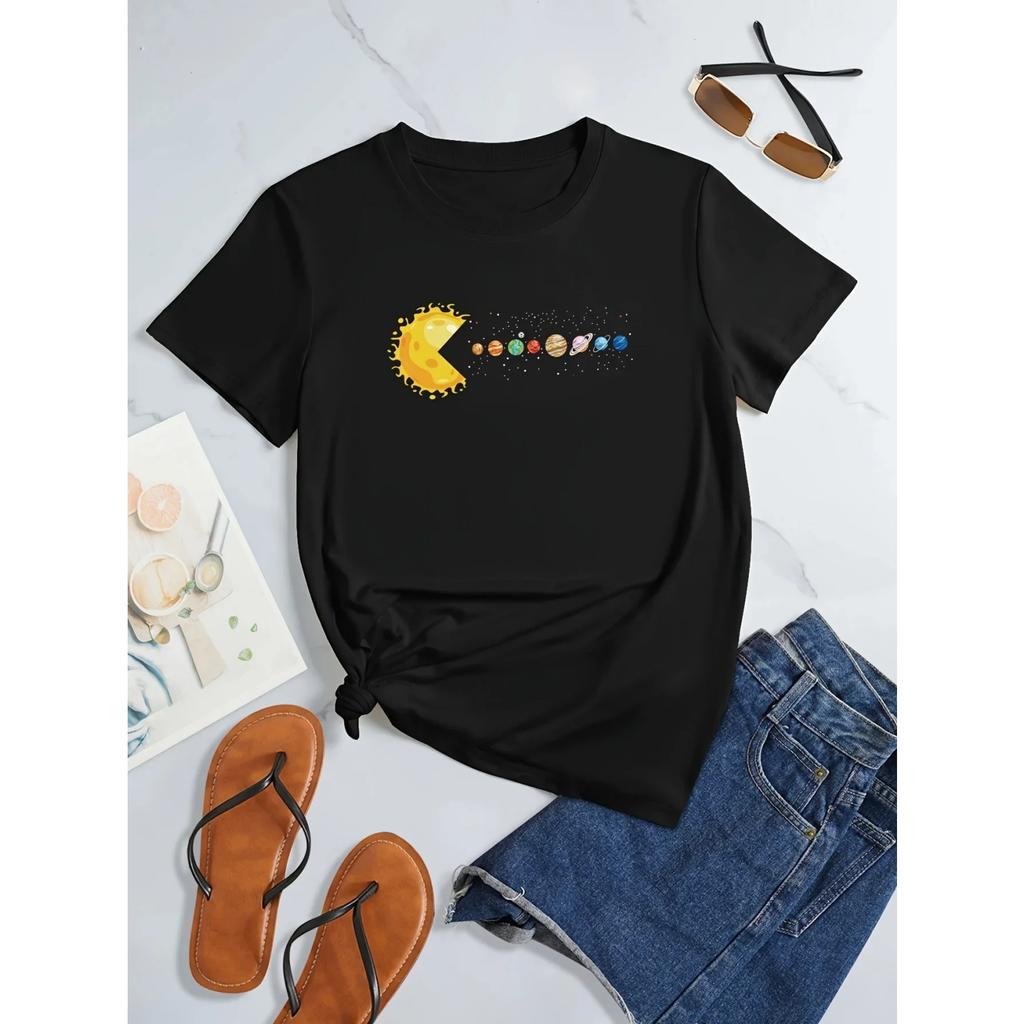 T-Shirt mit Planeten-Print des Sonnensystems, Lässiges Oberteil mit Rundhalsausschnitt und kurzen Ärmeln für Frühling & Sommer, Damenbekleidung