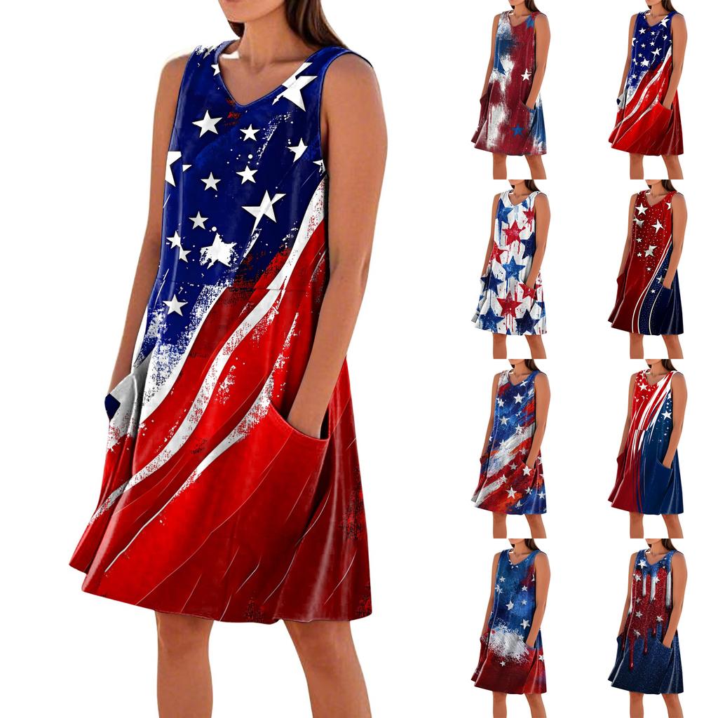 Sommerkleider für Damen Locker Strandurlaub Lässig Ärmellos V-Ausschnitt Sonnnenkleider Mit Taschen Trägerkleid
