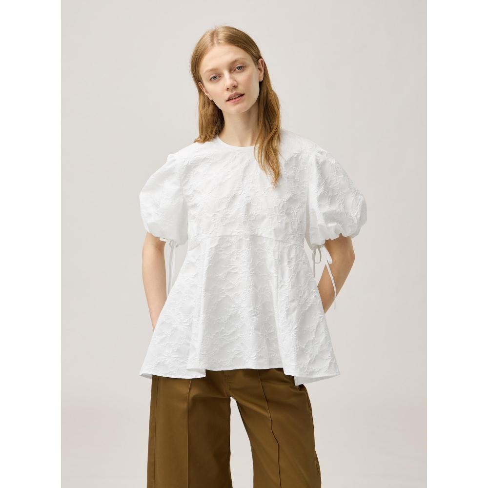GU by Uniqlo Balloon Sleeve Tunic is a uniquely designed loose-fitting top. The ribbon at the sleeve and the detail at the back of the neck are highlights, allowing for a balanced silhouette that can create various styles. This product is made of textured flower-patterned jacquard fabric, giving it an elegant appearance.