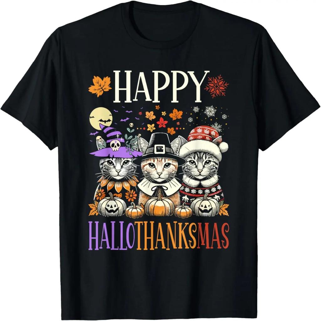 Happy Hallothanksmas Halloween Thanksgiving Christmas Cats T-Shirt
