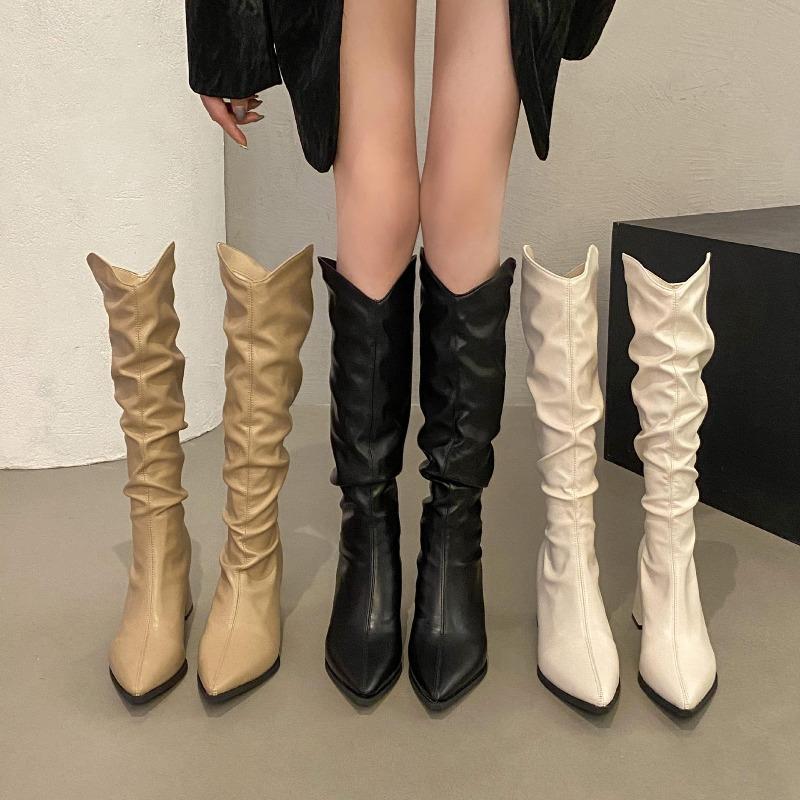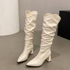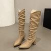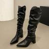Weiche PU-Leder kniehohe Stiefel Damen 2026 Frühling Herbst Dicke Absätze Lange Stiefel Plissiert Frau Schwarzer Reißverschluss hinten Ritter Botas