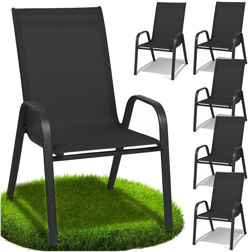 6x GARDEN CHAIR METAL ARMCHAIR BLACK MODERN BALCONY TERRACE Are you dreaming of relaxing on the terrace, balcony or in the garden and are you looking for the perfect chair ? Do you want to invest in something specific - something that will serve you for many years ? We offer a comfortable metal chair that will be the perfect complement to your relaxation zone! A STYLISH CHAIR PERFECT FOR YOUR GARDEN! The modern design of the chair will look very good in your garden, add charm to it and will be the perfect complement to the arrangement. STABLE CONSTRUCTION The stable base and refined construction provide exceptional comfort, convenience and safety of use . The frame of the chair is made of high-quality powder-coated steel . Double powder paint coating makes the chair more resistant to weather conditions. COMFORTABLE SEAT The seat and backrest are made of flexible textile upholstery , which will provide you exceptional comfort even during prolonged sitting. The elasticity of the material means that the seat evenly distributes the body weight, eliminating pressure points and ensuring maximum comfort . COMFORT ON HOT DAYS The textile upholstery allows free air circulation , which is very important especially on warmer days. Thanks to this, sitting on the chair is pleasant , and you can enjoy coolness even on hot days. The fabric is resistant to weather conditions such as rain and UV rays, as well as moisture and dirt. EVERYTHING FOR YOUR COMFORT! The slightly reclined backrest provides natural support for the spine, which helps maintain correct posture while sitting. The armrests provide additional support for the arms, significantly increasing seating comfort. They allow the arms to position naturally, which reduces muscle strain and prevents discomfort. WITH ATTENTION TO DETAIL! The legs are additionally equipped with plastic covers, so that they do not scratch the surface on which they stand. Our garden chair is made of easy-to-clean materials , which allow for quick and effective removal of dirt. The chairs are stackable , meaning they can be stacked one on top of the other , saving space during storage or transport. SPECIFICATION 6 pieces in a set! Total height: 89 cm Total width: 55 cm Total depth: 80 cm Side leg width: 67 cm Front leg width: 47 cm Height seats: 37 cm in the back; 42 cm in front Seat width: 44 cm Seat depth: 43 cm Backrest height: 58 cm Backrest width: 44 cm Armrest height: 58 cm Armrest width: 4.5 cm Maximum load: approx. 120 kg Permissible measurement error +/- 2 cm. Self-assembly chairs – convenient and safe delivery! Our garden chairs are delivered for self-assembly. This allows us to guarantee their safe transport and compact packaging , which facilitates storage and carrying. Easy and quick assembly – clear instructions and a complete set of essential components make assembly simple and intuitive. Safe delivery – the furniture is carefully packaged, minimizing the risk of damage during transport. Thoughtful design – after assembly, the chairs are stable, solid, and ready to use. Everything you need is included – in just a few moments you can enjoy the comfort of your new chairs! Video instructions included. FAQ - Frequently Asked Questions What material is this chair made of? The chair is made of high-quality powder-coated steel , which gives it exceptional durability and resistance to damage. Powder coating is done twice , which further increases its resistance to weather conditions such as rain, moisture or UV radiation. Is the chair weather resistant? Yes, thanks to the double powder coating, the chair features increased resistance to weather conditions such as rain, wind, and sunlight. It's an ideal choice for a garden, terrace, or balcony. What are the dimensions of the chair? The chair has the following dimensions: Height : 89 cm Width : 55 cm Depth : 80 cm Thanks to these dimensions, it is comfortable to sit on, providing adequate spaciousness and comfort. Does the chair require any special maintenance? The chair does not require any complicated maintenance. To keep them in good condition, simply clean the fabric upholstery regularly and wipe the steel frame with a damp cloth. It's a good idea to store them in a dry place during the winter to ensure their longevity.