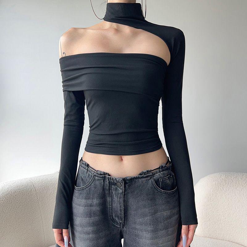 2026 Frühling Schwarzes Langarm-Halter-Off-Shoulder-Bandeau-Top für Damen: Nischen-Hot-Girl-Stil