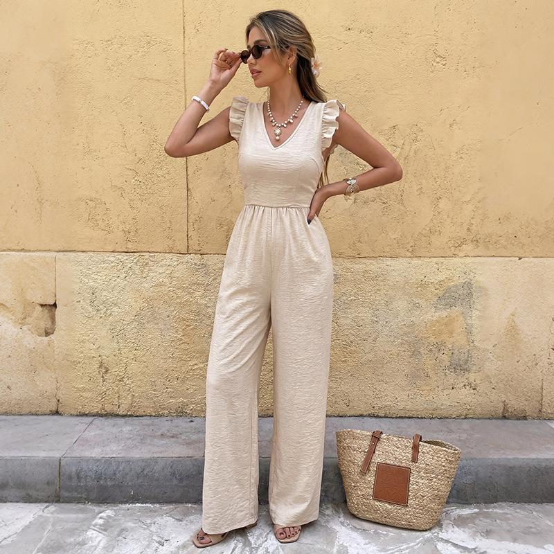 Summer Women's Jumpsuit V Neck Ruffle Sleeveless High Waist Wide Leg Pants Casual Elegant Back Bow Tie One Piece Outfits for Vacation