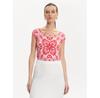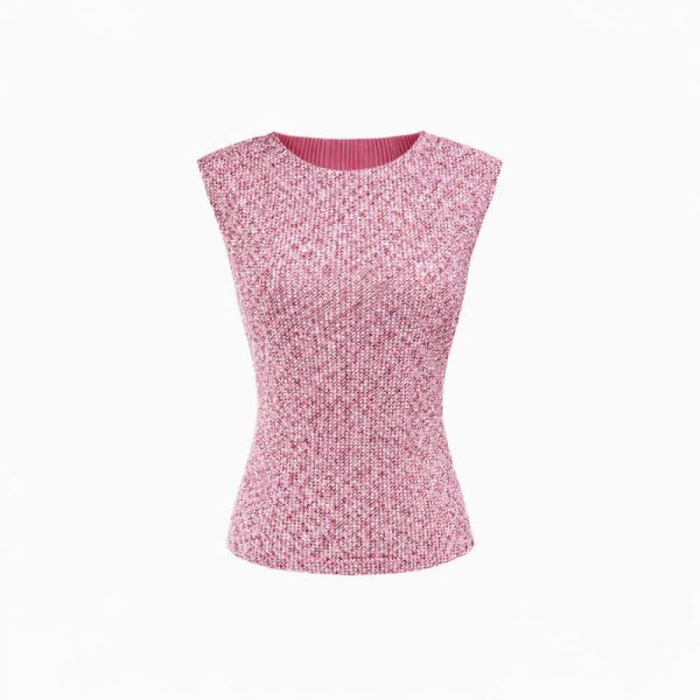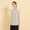 The Printed Round Neck Sleeveless Tee (LTSTS13P) is a top designed with a combi structure featuring different colors on the front and back. The front boasts a speckled print, while the back is solid, allowing for reversible wear without distinction between sides, making it a practical item that can create two moods. Its flexible pleated texture naturally covers the body, providing comfort during wear.