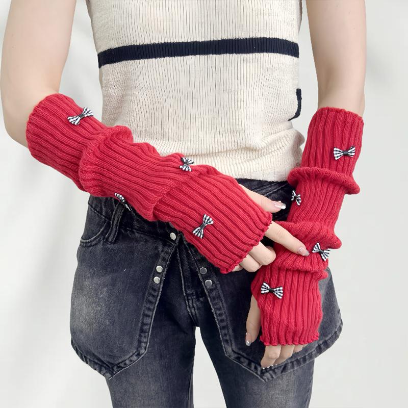 Sweet Cute Fur Bowknot Fingerless Gloves Girl Cosplay Sleeves Arm Sleeves Wool Knitted Sleeves