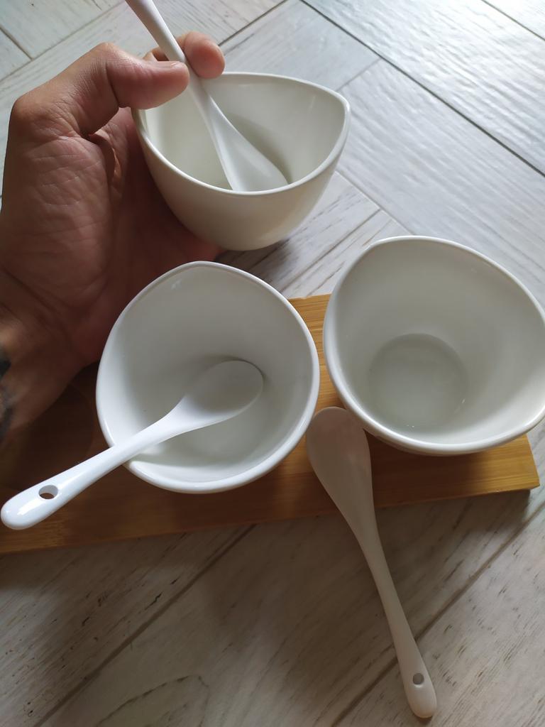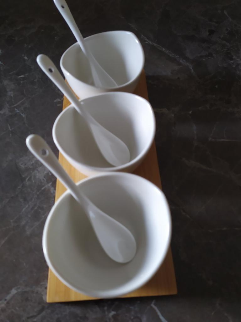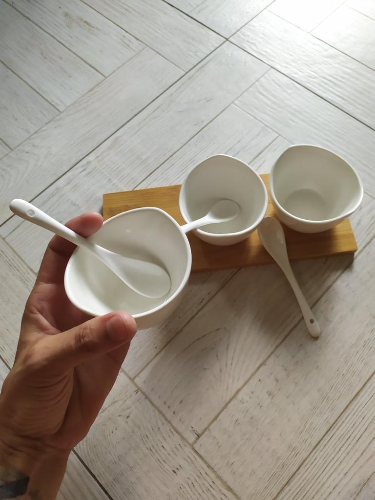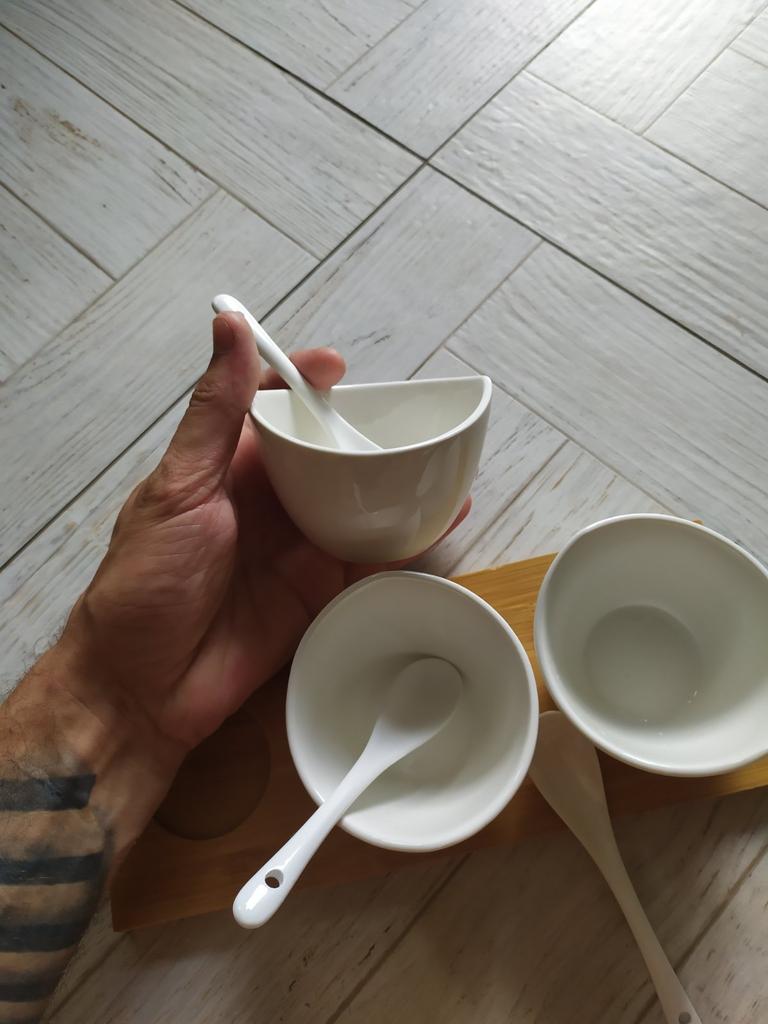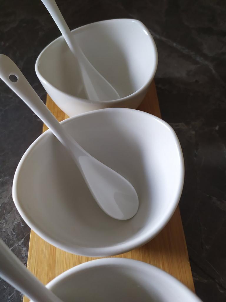 The eye eats with you and with this beautiful bowl set you can easily implement it! Whether tapas, mezze or tasty little things, olives, dips and snacks are stylishly presented here. We really enjoy this set consisting of three porcelain bowls, matching spoons and a wooden board and we already have many ideas for what to fill the bowls with. For example, also perfect for the sauces at every barbecue party!