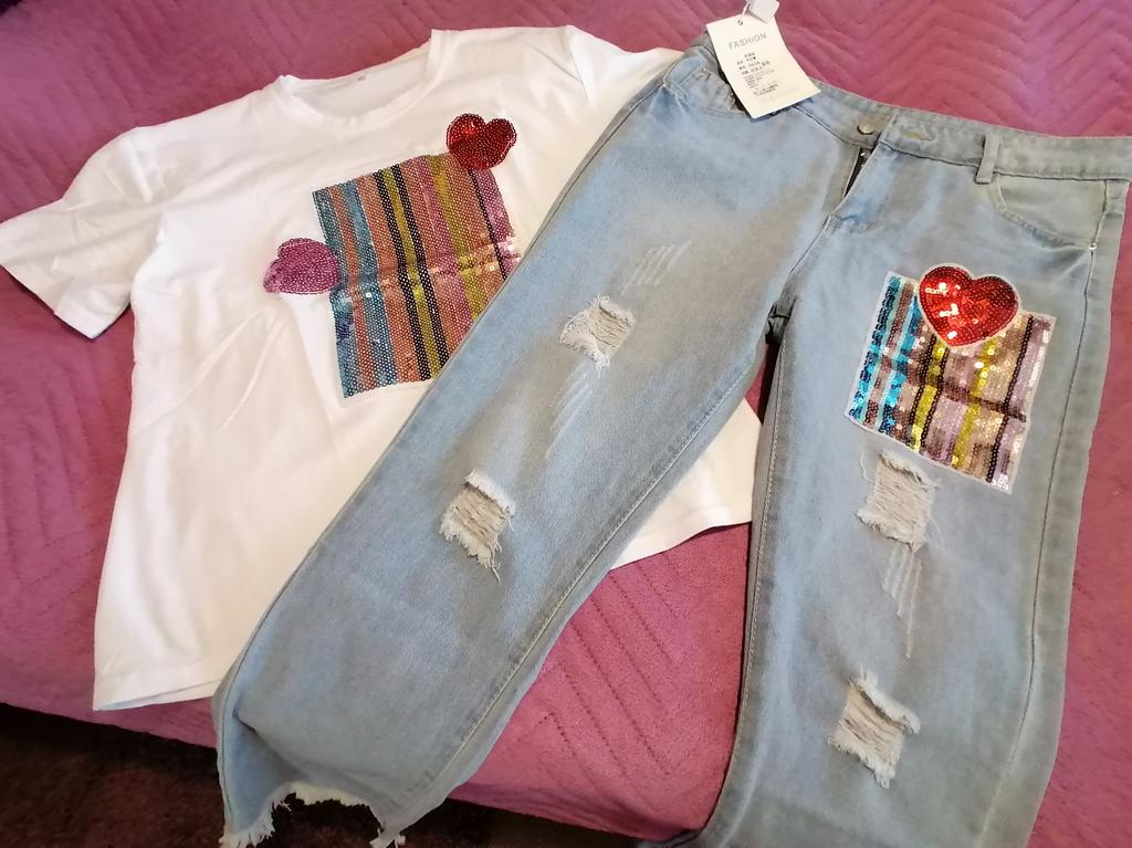 Summer Women Sets Fashion Short Sleeve T Shirt + Hole Jeans 2pcs Girl Casual Pants Suits