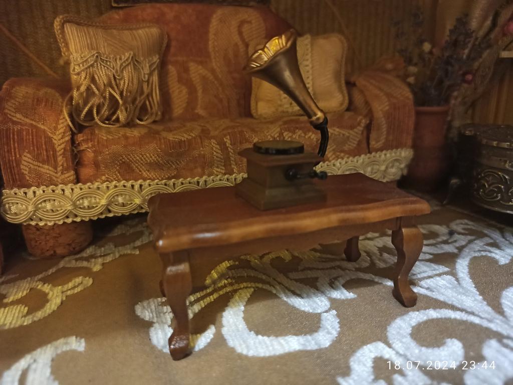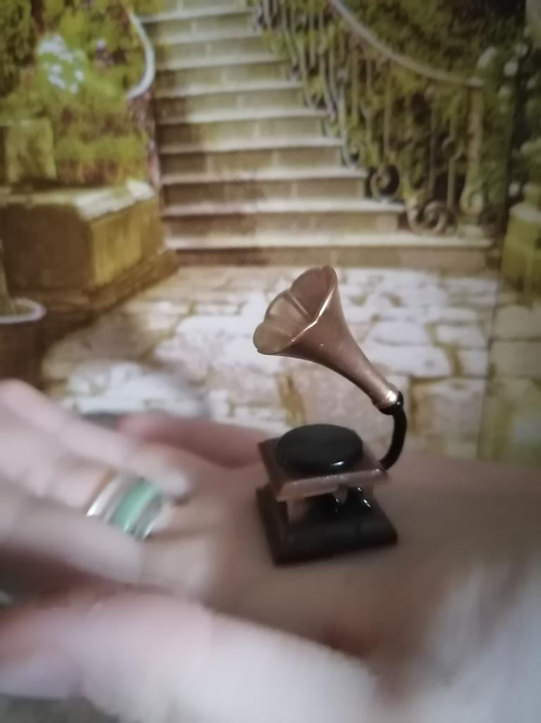 The gramophone is plastic, simple, but not bad for the price. Fits into the interior. Thank you.