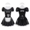 Womens Patent Leather Maid Cosplay Costume Short Sleeve Lace Trimming Maid Role Play Outfit