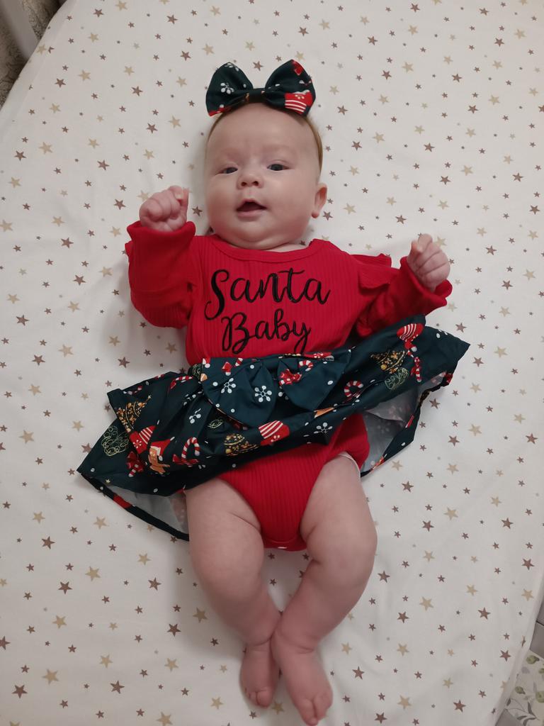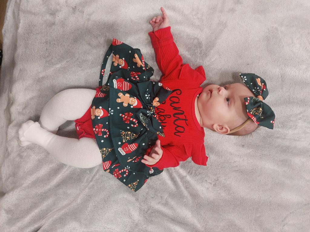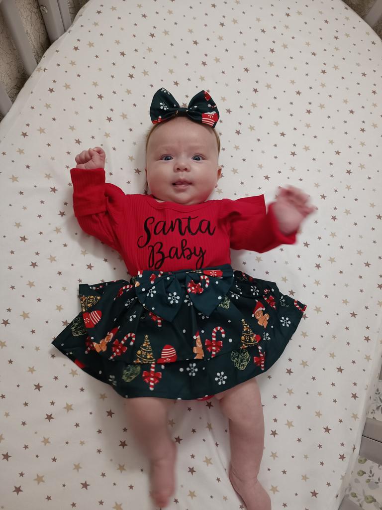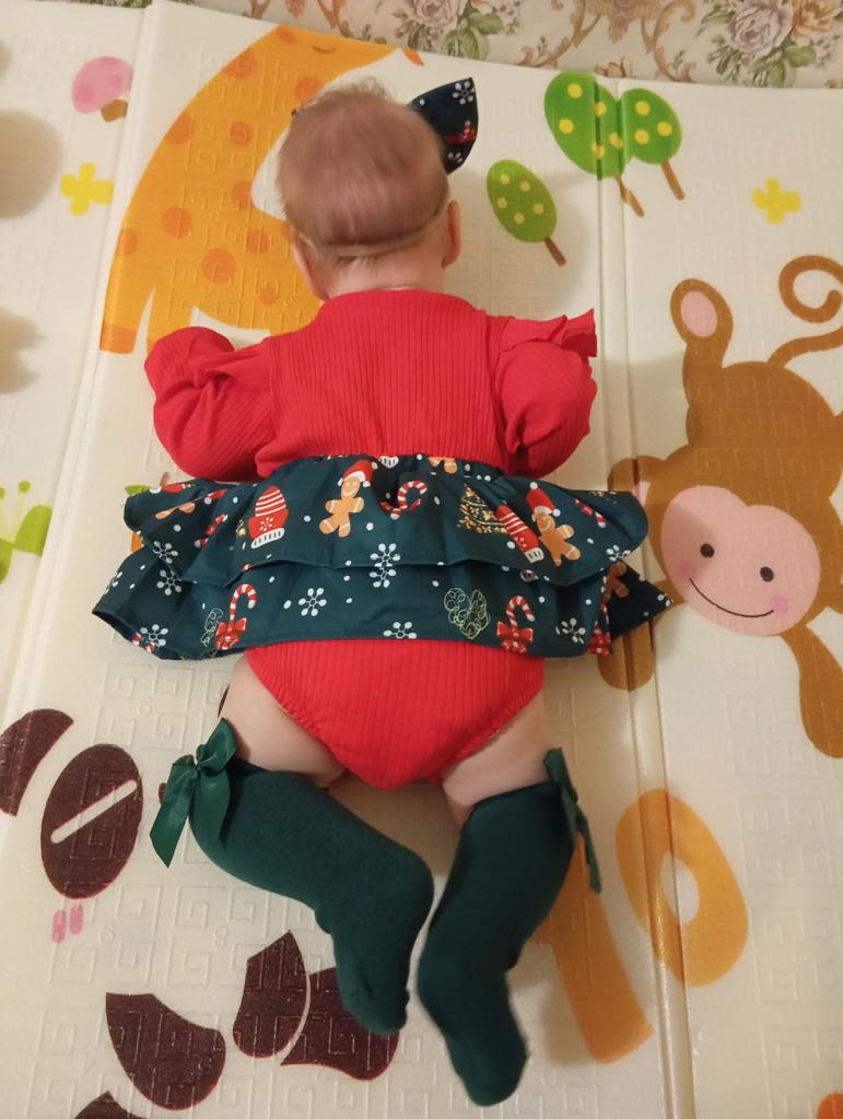 Unfortunately, the size chart does not correspond (from zero to 6 months) The baby is 3 months old, it's terribly small, the elastic is too tight, the skirt is practically on the baby's chest, the bow on the skirt is sewn in such a way that the inscription is not visible in full. The skirt barely covers the bottom, and is in the middle of the tummy