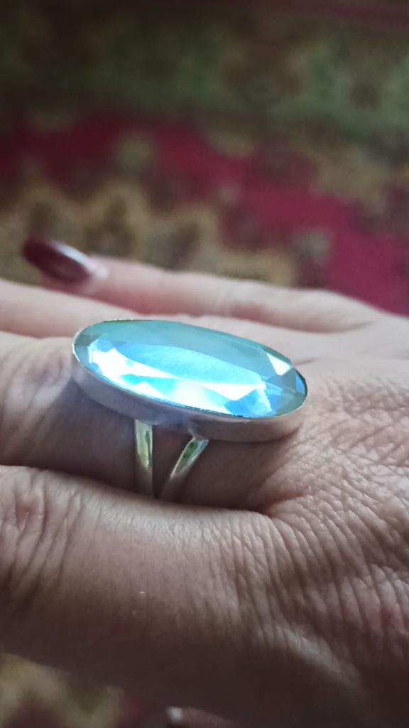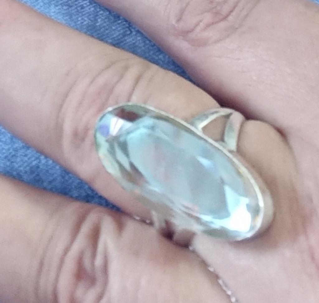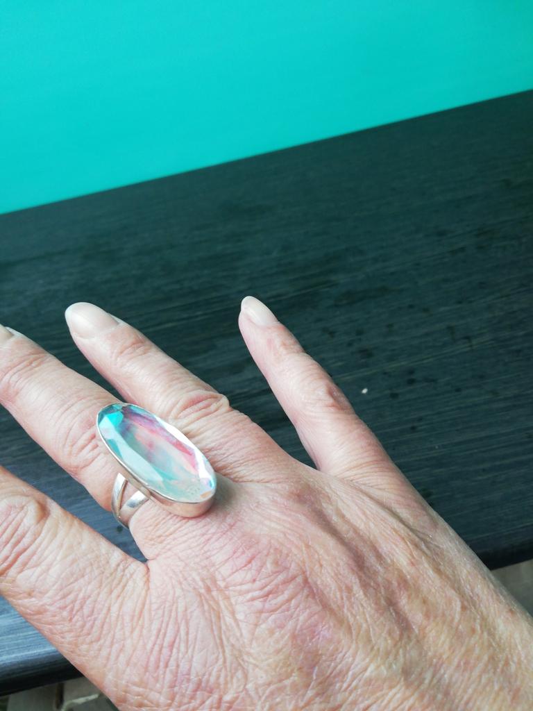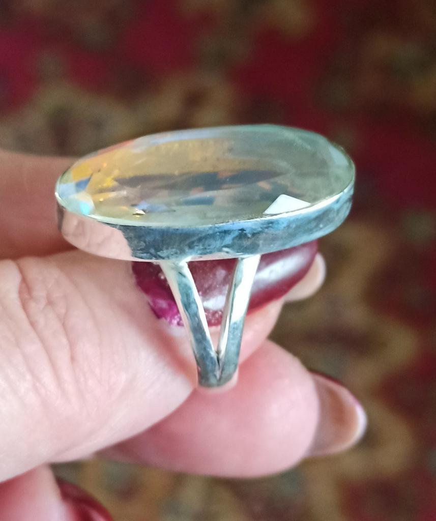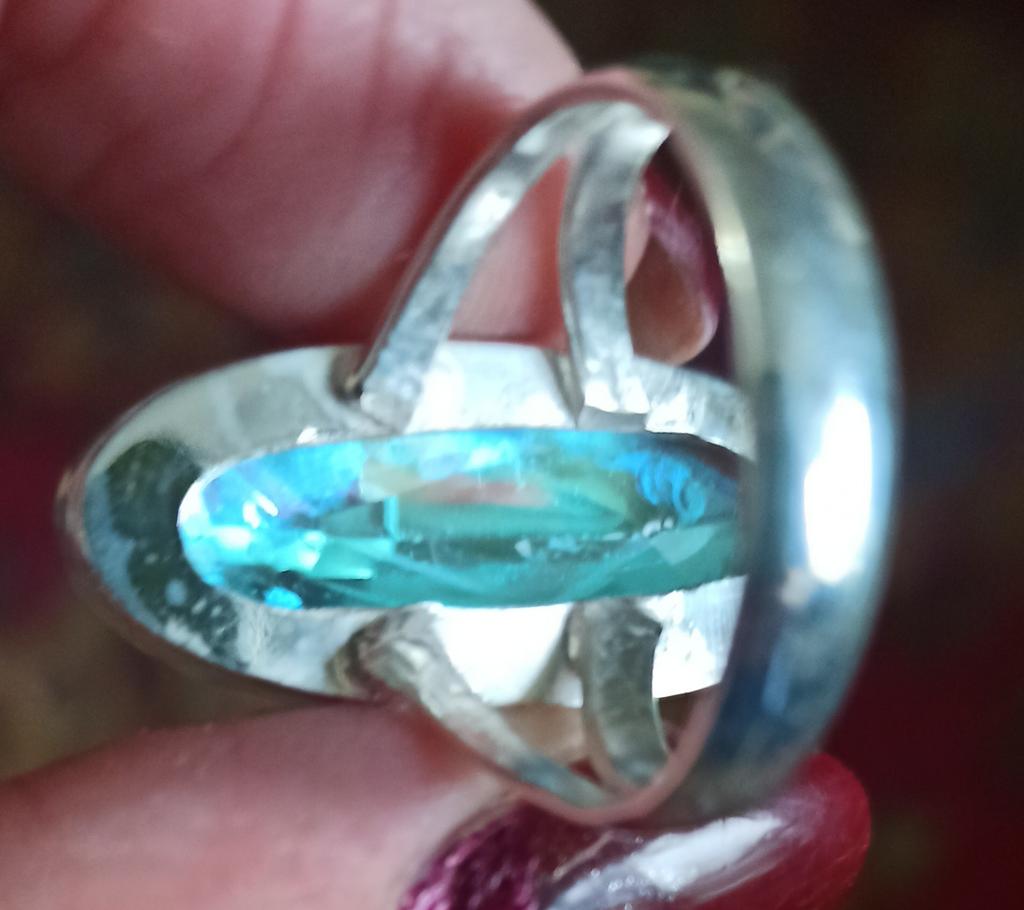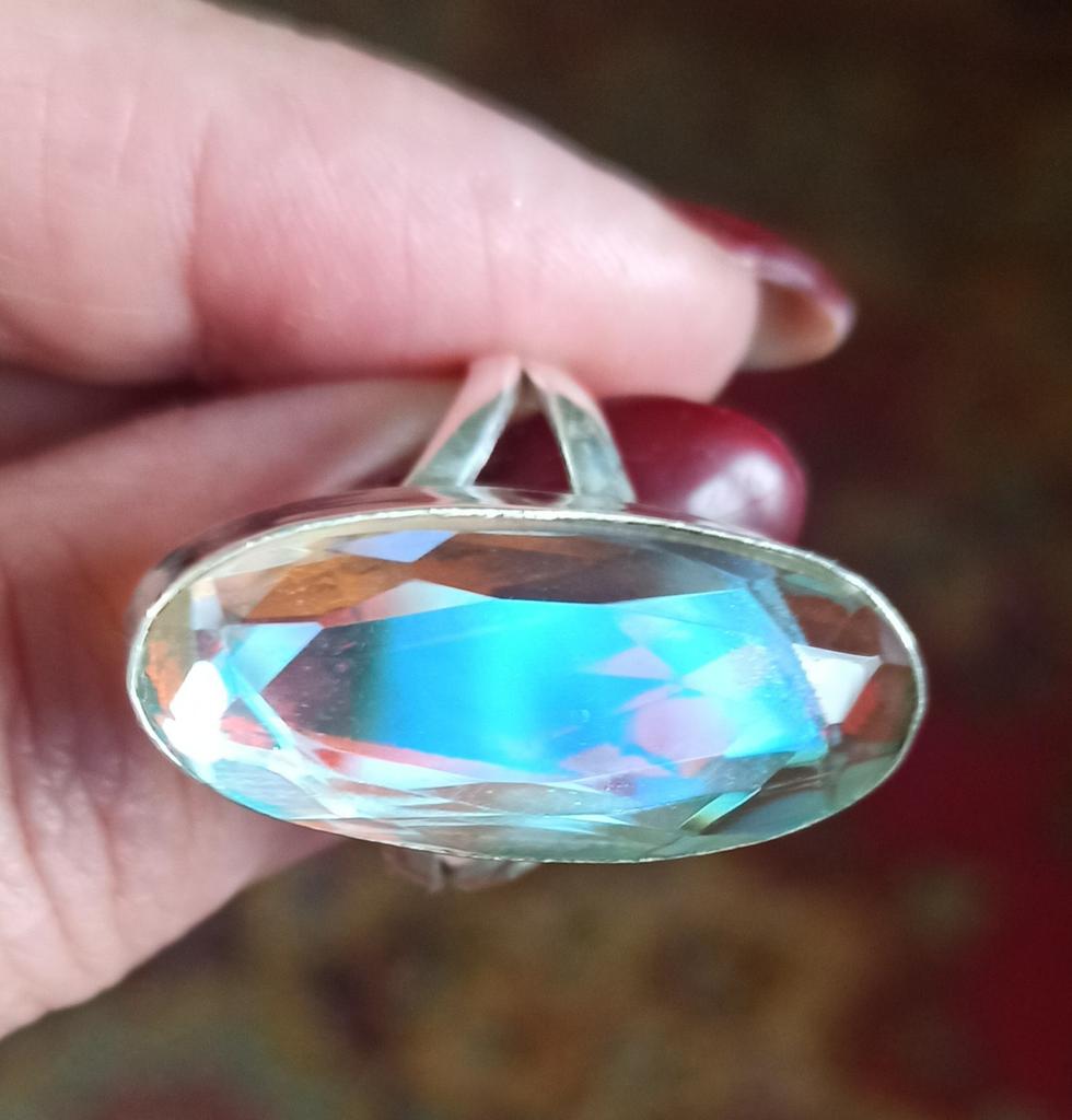A very beautiful ring. And it looks like it's silver (there's a mark or sample). And the stone is artificial mystic topaz (there are no natural ones). True, it's very tight on the finger, but you can always make it bigger. Or lose weight :))