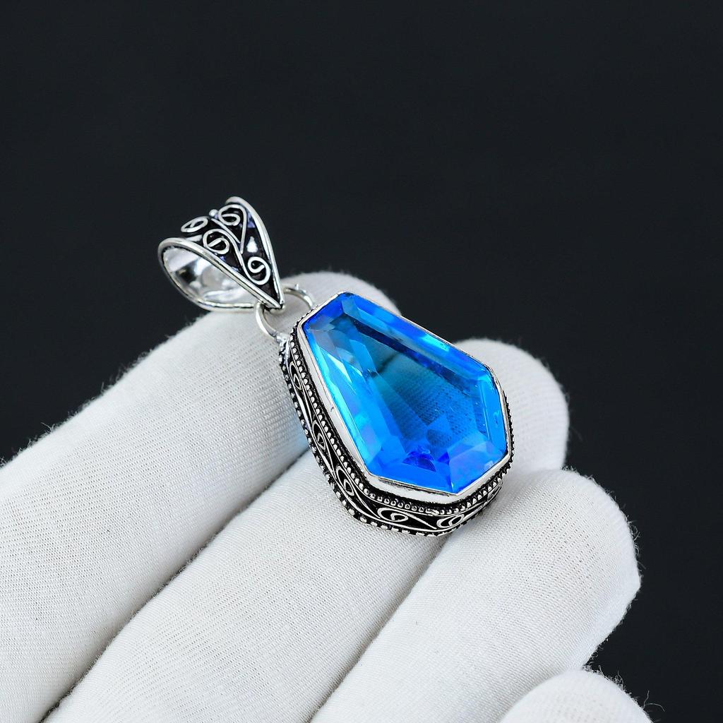 Coffin Shape Swiss Blue Topaz Pendant, 925 Sterling Silver Pendant, Handmade Pendant, Coffin Gemstone Jewelry, Silver Jewelry For Women Gift
