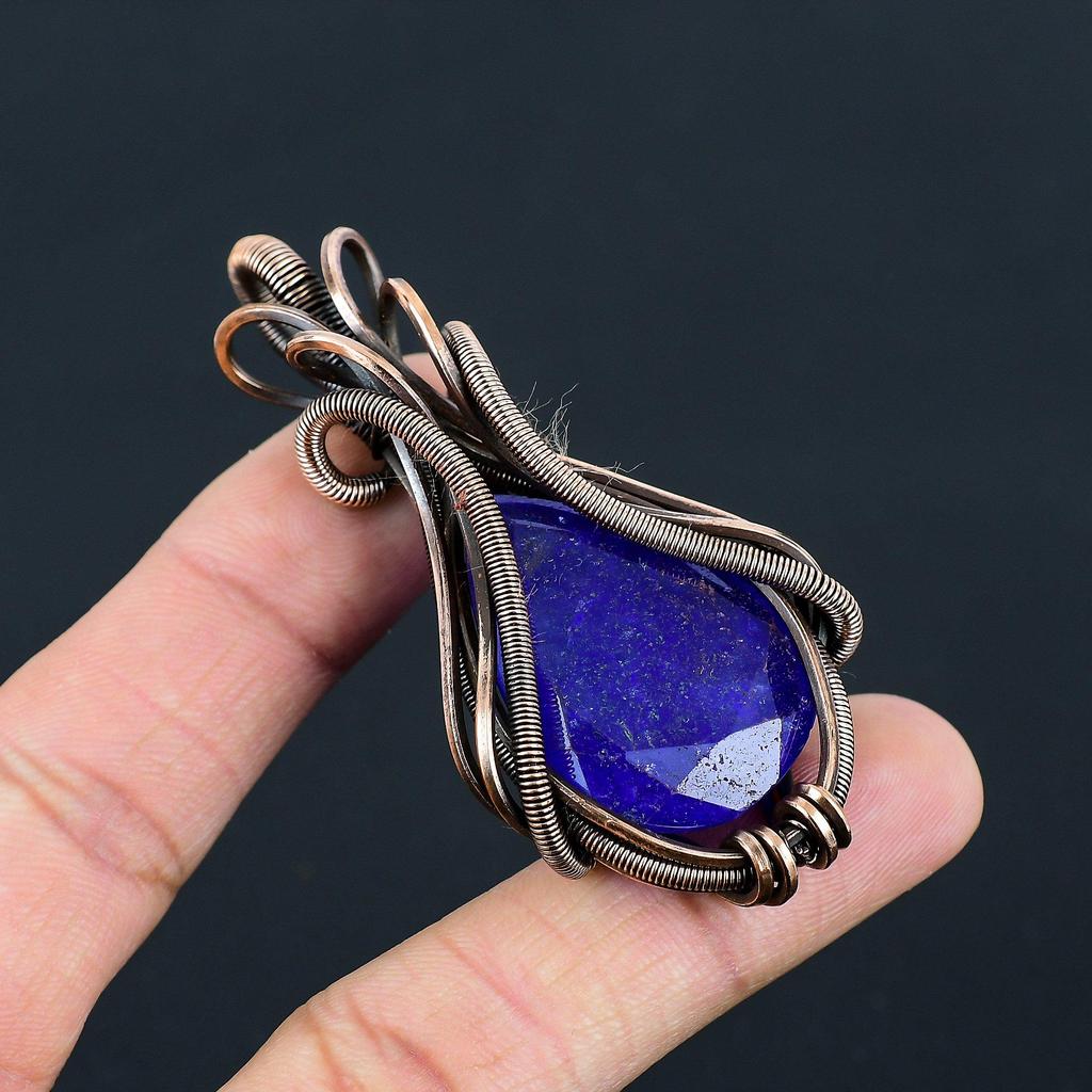 Blue Sapphire Lab-Created Gemstone Handmade Pure Copper Wire Wrap Jewelry Pendant For Love