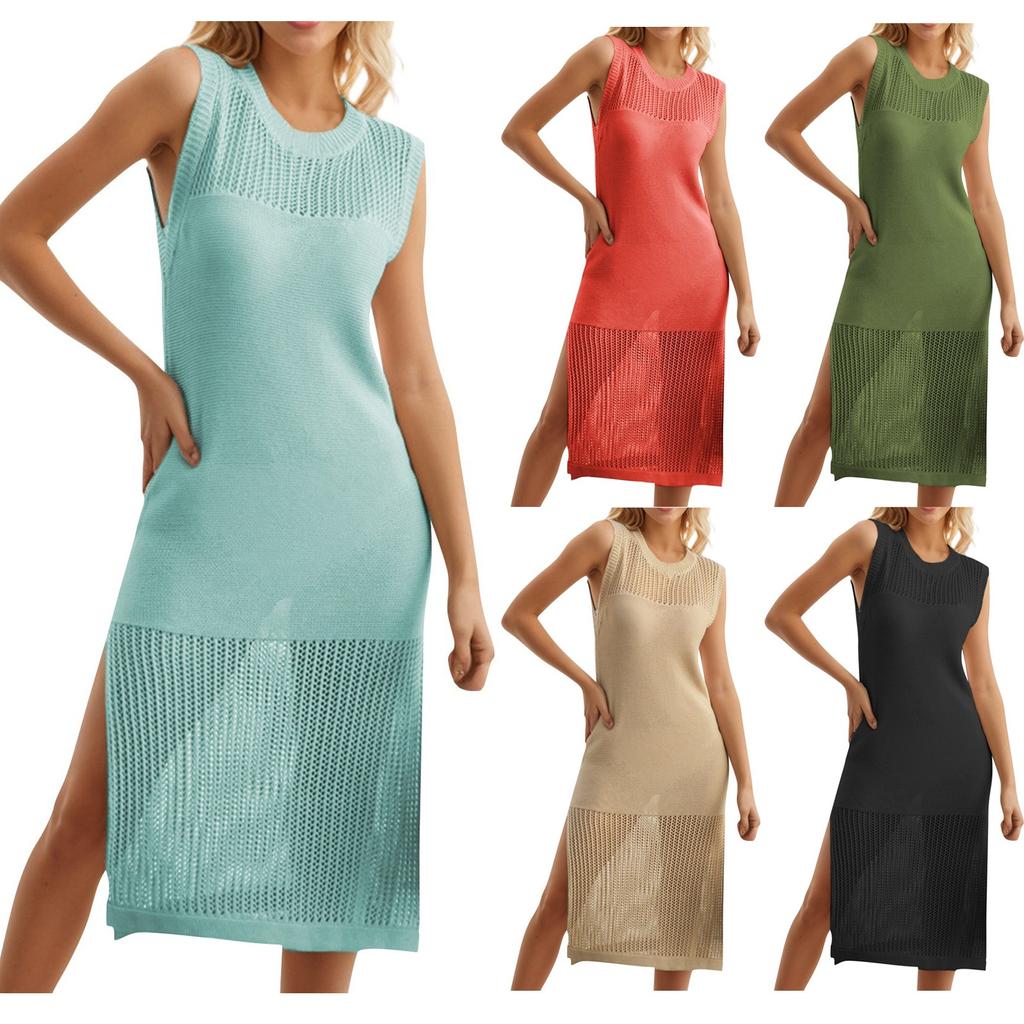 Women's Swimsuit Cover Up Crochet Knit Dresses Long Sleeveless Crewneck Swimwear Dress Side Split Beach Midi Dress