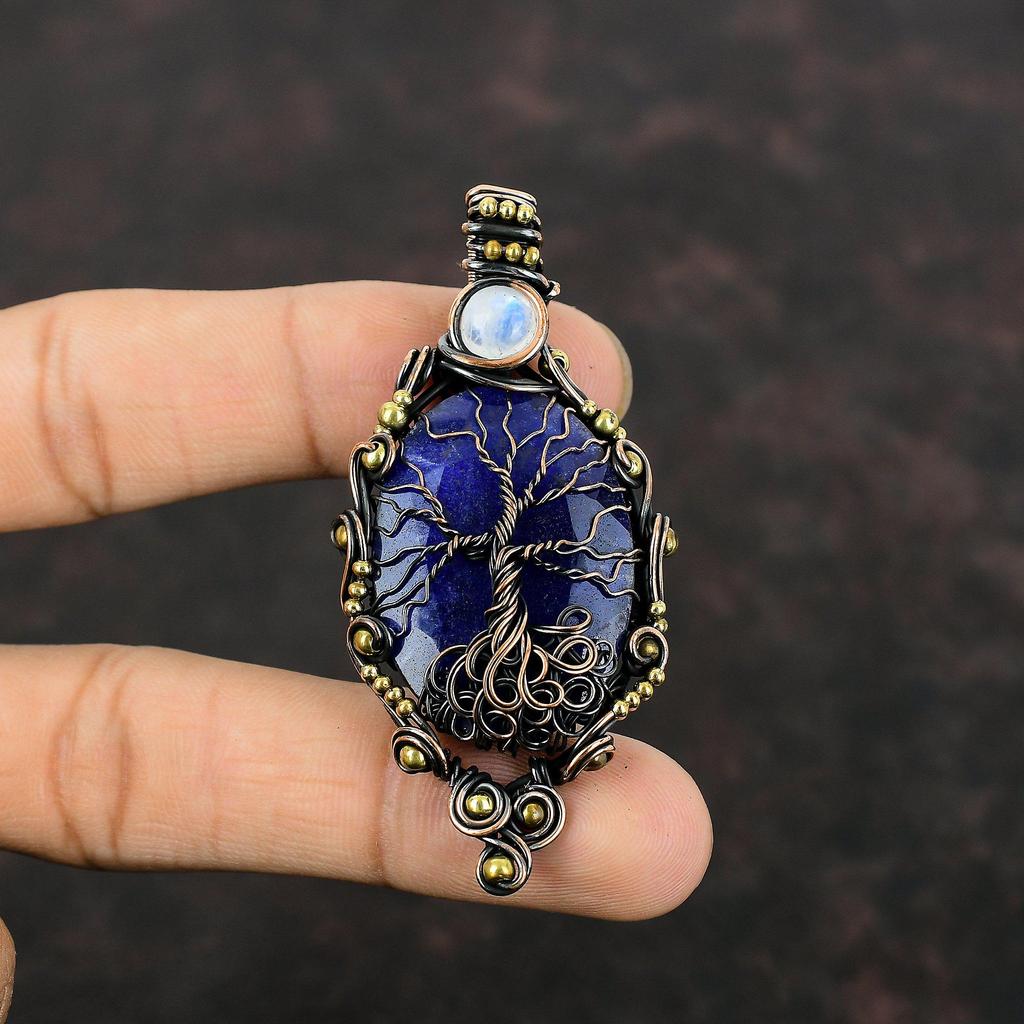 Tree Of Life Faceted Blue Sapphire Pendant Copper Wire Wrapped Gemstone Pendant Rainbow Moonstone Pendant Handmade Jewelry Anniversary Gifts