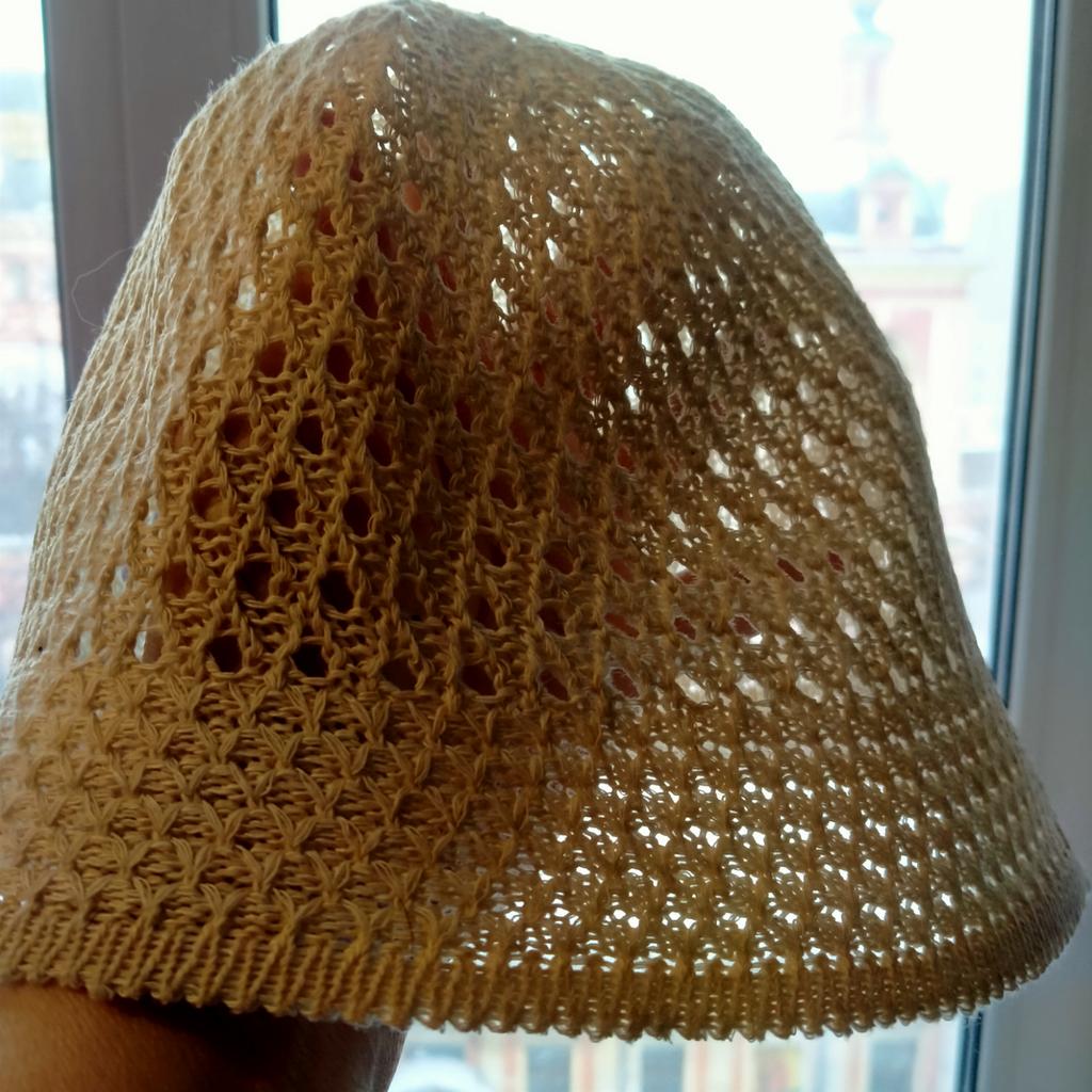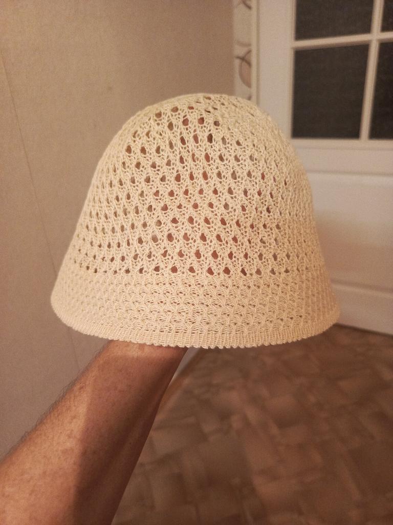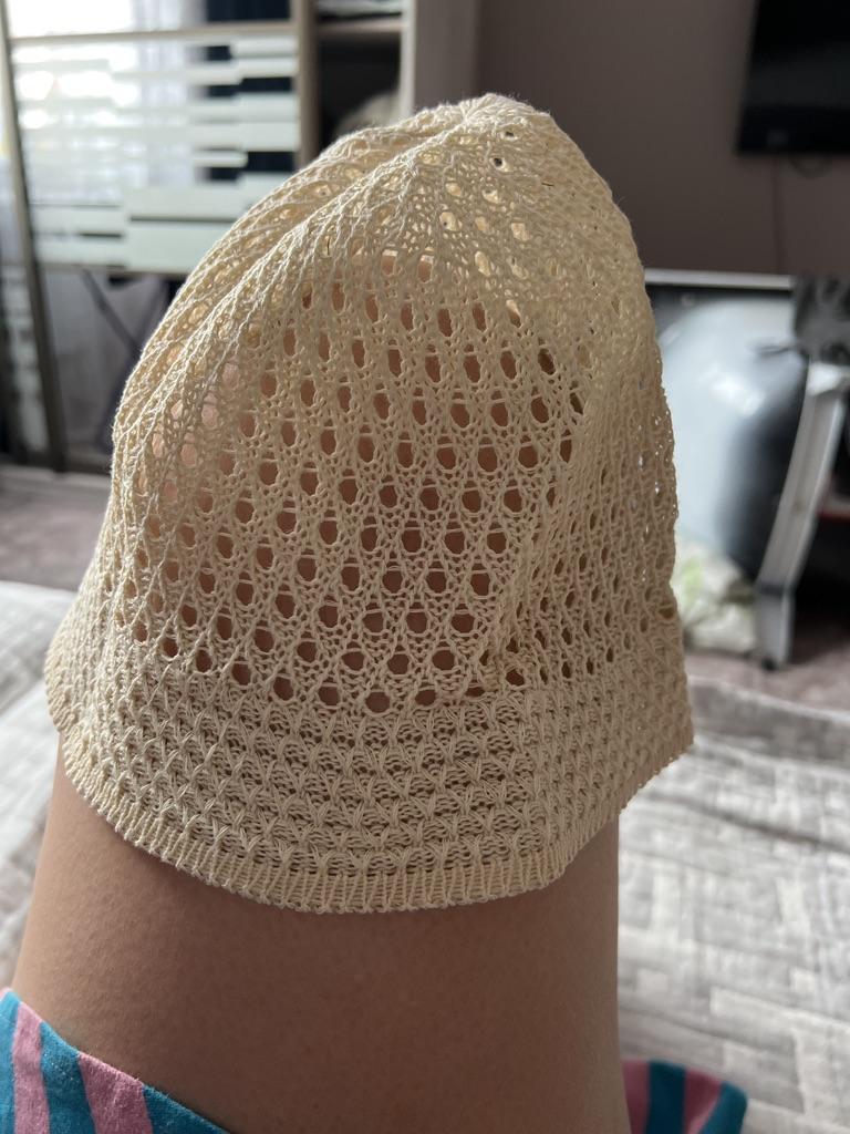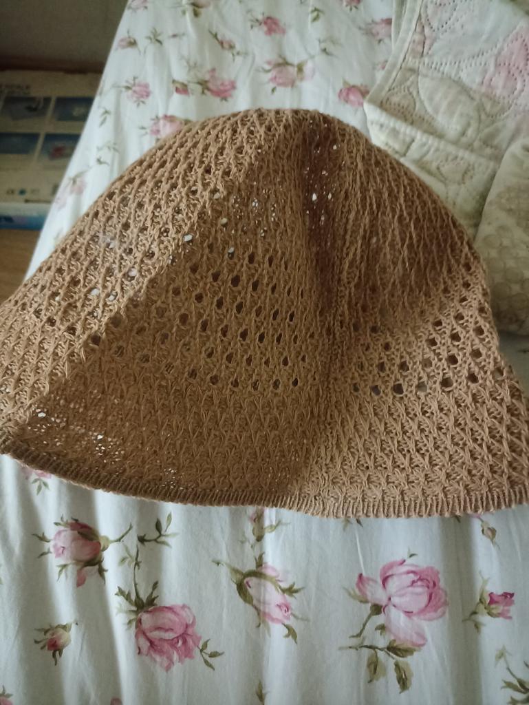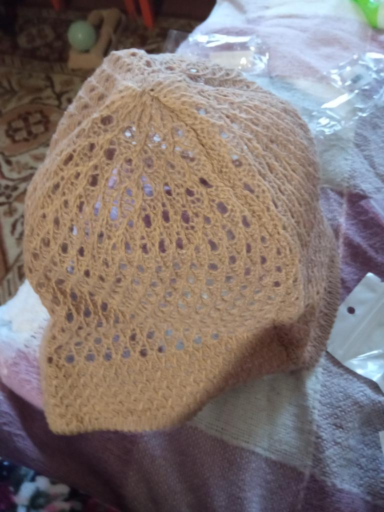 The hat is knitted from stiff threads. It does not fit tightly to the head. I finished it by pulling the cord along the rim. It would have been cool if it had been made from soft threads.