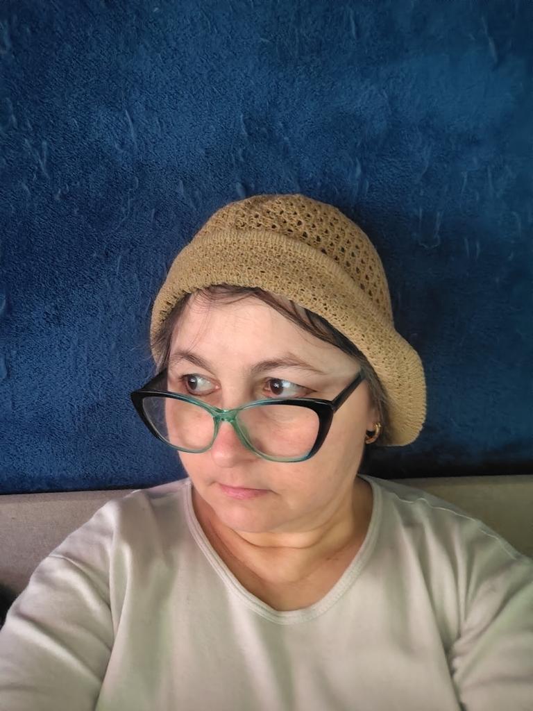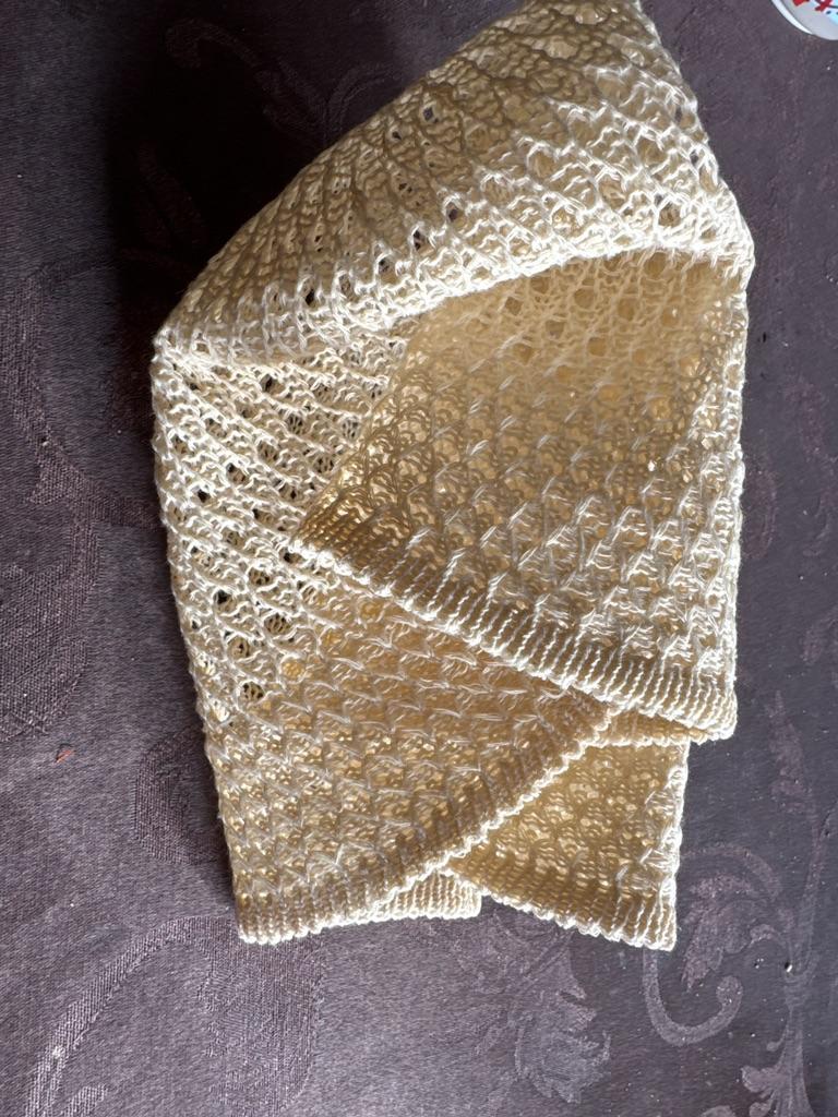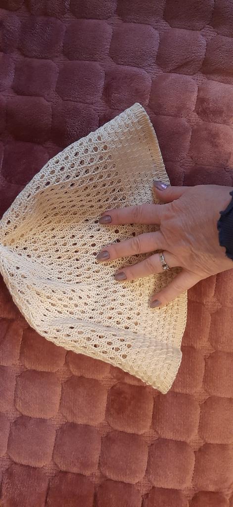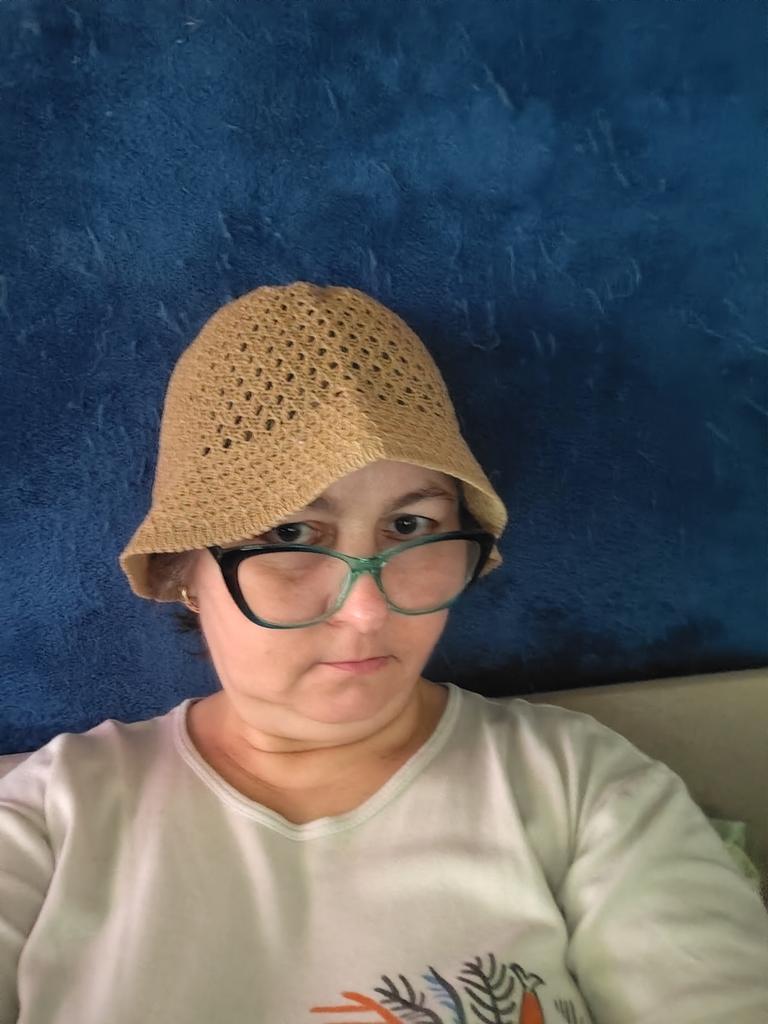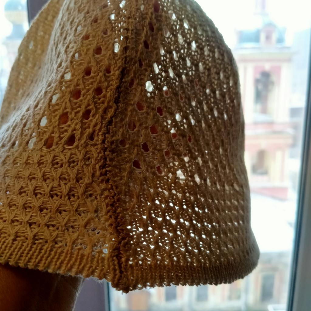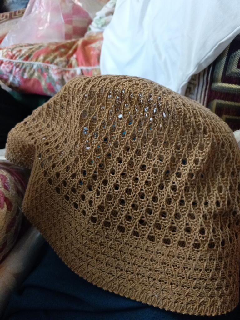 The hat is knitted from stiff threads. It does not fit tightly to the head. I finished it by pulling the cord along the rim. It would have been cool if it had been made from soft threads.