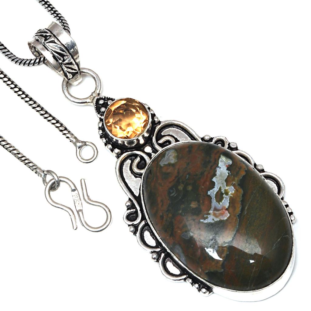 Pendant Rainforest Jasper Citrine Quartz Gemstone Handmade Silver Jewelry 2.75"