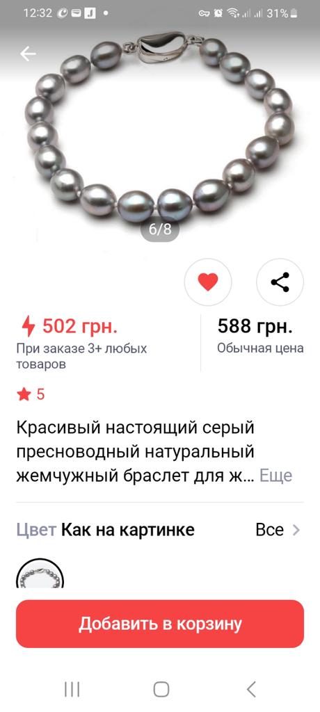 Silver clasp. Artificially grown pearls. When buying, pay attention to the length. It will be too small for a full hand.