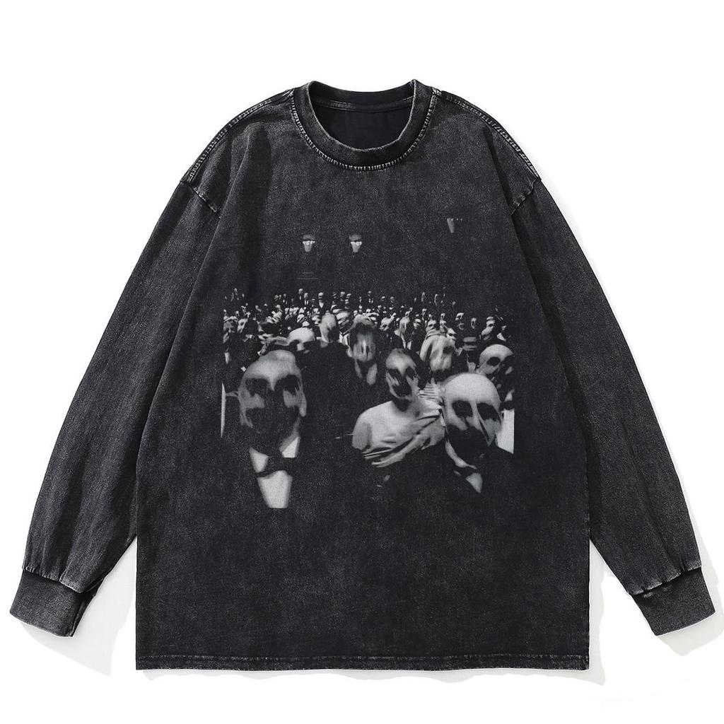 Streetwear Ugly Face Graphic Washed Black T-Shirt Cotton Unisex Plus Size Long Sleeves T Shirt