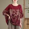Summer Hemp Cotton Blouse EthnicStyle Bat Sleeve Loose Oversized Round Neck T-shirt Casual Comfortable for Women