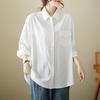 Long Sleeve Art Retro Washed Large Size Loose Blouses Skinny Lapel Collar Single Breasted Shirt Chest Pocket Top for Women