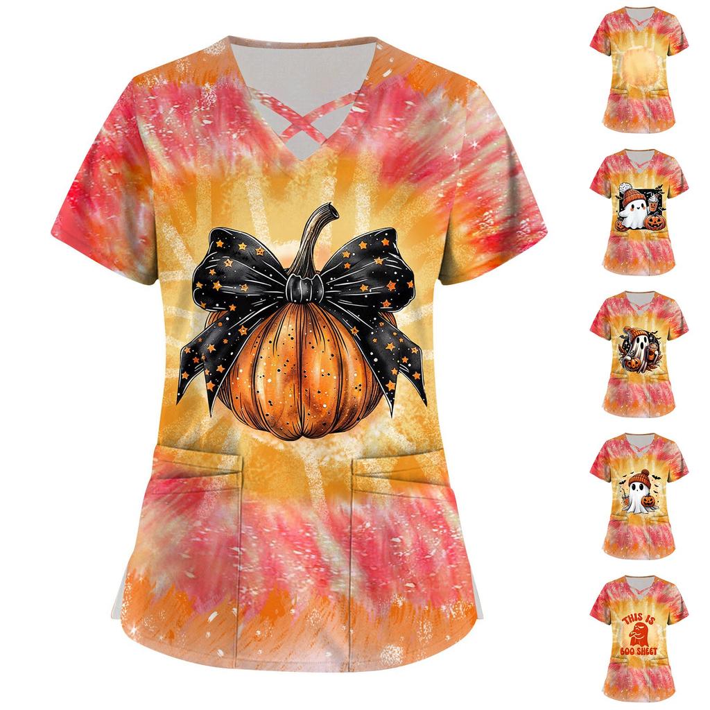 Women's Printed Work Clothes With V Neck And Double Layer Pocket Basic Tops Pullover
