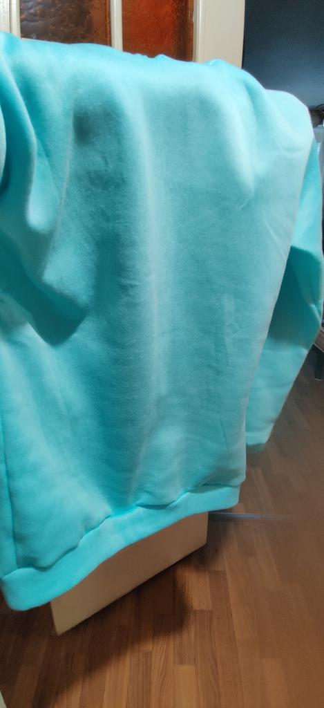 The suit is cute from the back. There's nothing at all on the front of the sweatshirt. The fabric is thin, even see-through, but with a fleece lining inside. I would say it's a suit for a cool spring. The pants are really tight, like leggings 🤭, I thought XL would be more loose