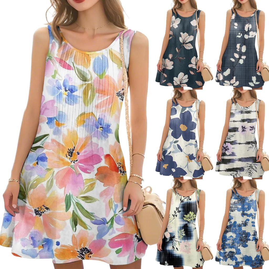 Women's Casual Fashion Floral Print Round Neck Sleeveless Dress
