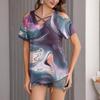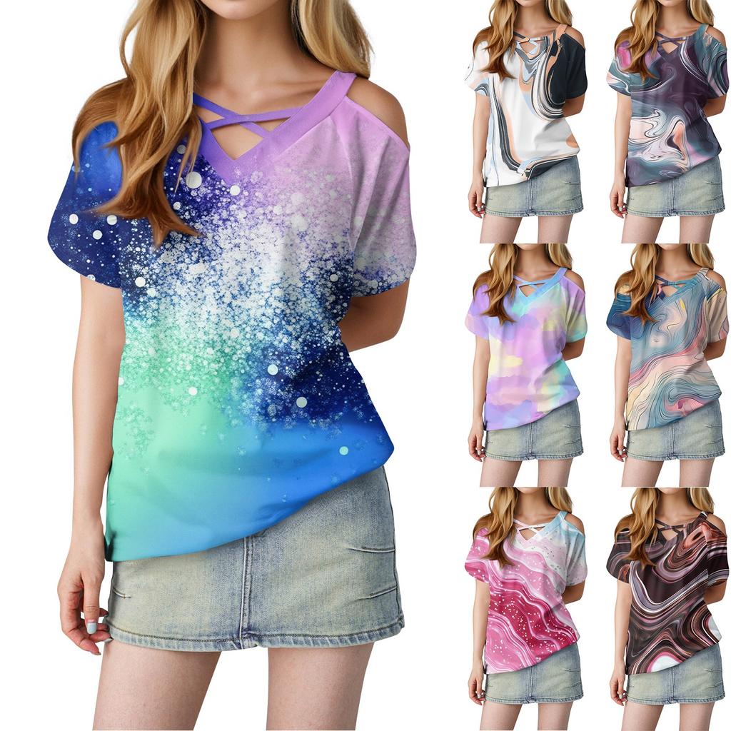 Women's Gradient Print Casual Off-Shoulder Strappy V-Neck Short-Sleeved T-Shirt