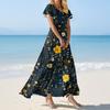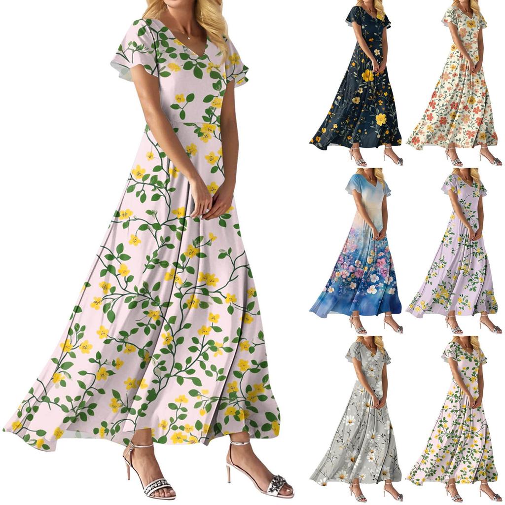 FashWomen's Loose Casual V-Neck Short Sleeved High Waisted Print Dress