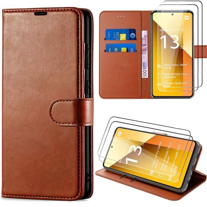 Coque + 2 Verres Trempés - E.F.Connection - Redmi Note 13 5G - Etui Magnétique Antichoc - Cuir PU - Marron