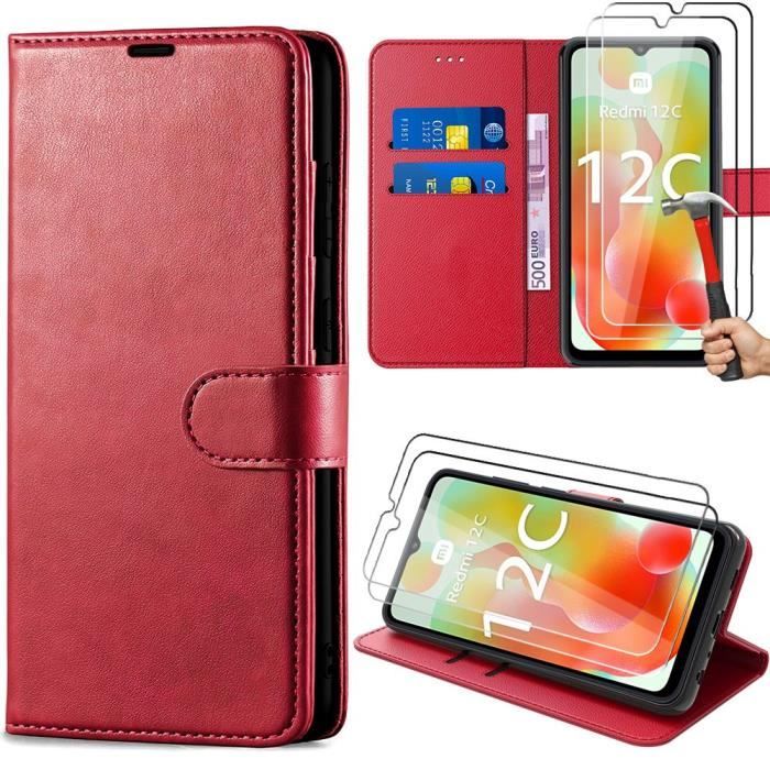 Coque + 2 Verres Trempés pour Xiaomi Redmi 12C-11A, Coque Effet Cuir Rouge Fermeture Magnétique