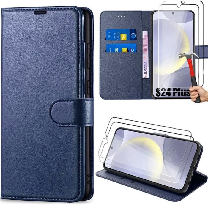 Coque - Efconnection - pour Samsung Galaxy S24 Plus - Effet Cuir - Bleu Marine - 2 Verres Trempés