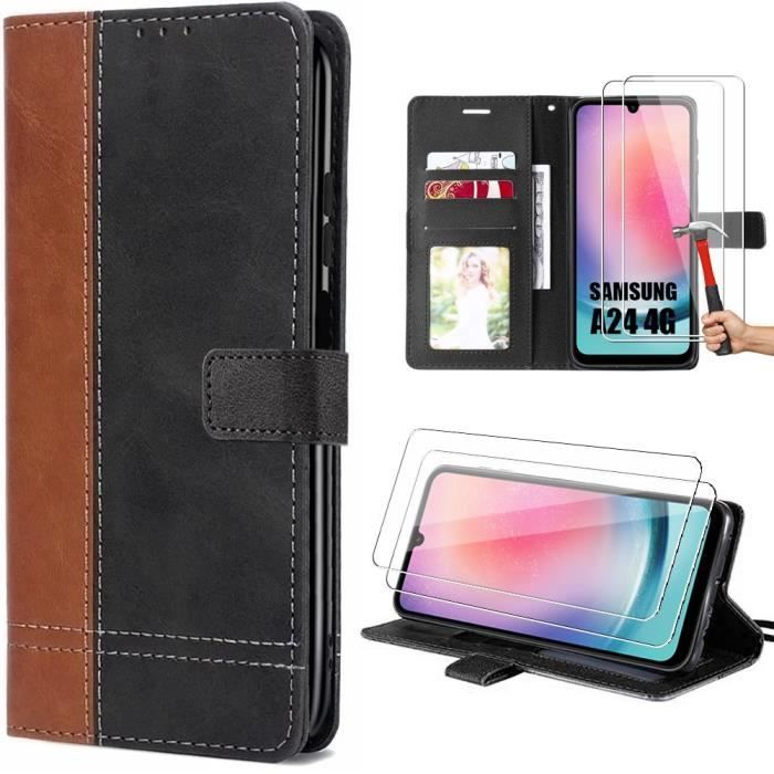 Coque pour Samsung Galaxy A24 avec 2 Verres Trempés, Synthécuir Bicolore Marron