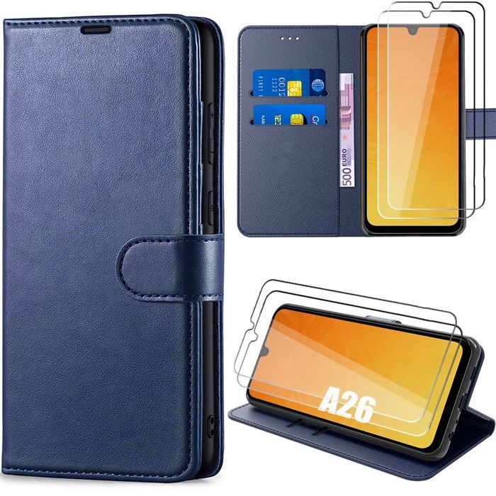 Protective Case - BOOLING - for Samsung Galaxy A26 5G - Navy Blue Leather Effect - Shockproof - 2 Tempered Glasses