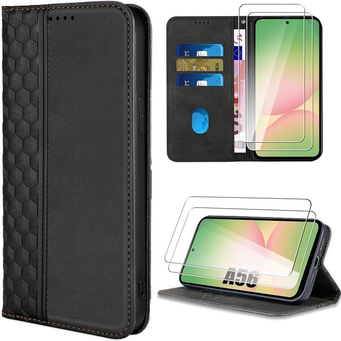 Protective Case - BOOLING - for Samsung Galaxy A56 5G - Black Synthetic Leather - Mosaic Pattern - 2 Tempered Glasses