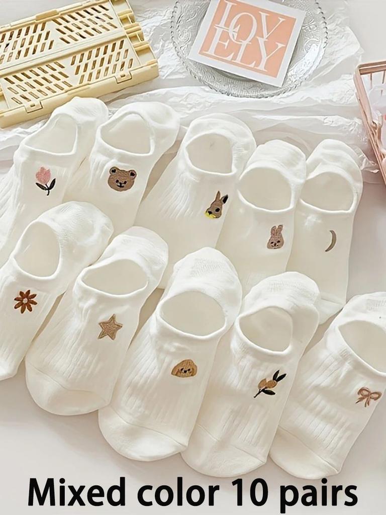 10 Pairs Comfy & Stretchy Women's Cartoon Ankle Socks - Invisible Polyester/Spandex Blend, Fun Embroidery