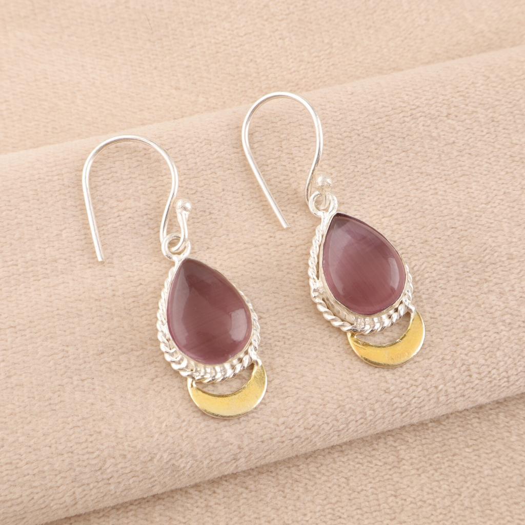 Purple Cat's Eye Gemstone 925 Sterling Silver Jewelry Handcrafted Earrings 1.5" EE-162-36