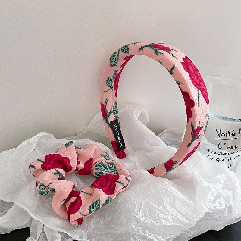 Retro French Pink Dried Rose Ruched Headband and Hair Tie Set