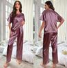 Experience ultimate comfort and style with this women's summer pajama set, featuring a short sleeve top and long pants. Crafted from luxurious silk, this loose-fit casual homewear offers a cool, breathable feel, perfect for relaxing at home during warm nights. The elegant design and high-quality material ensure you'll look and feel your best, whether you're lounging around or getting a good night's sleep.