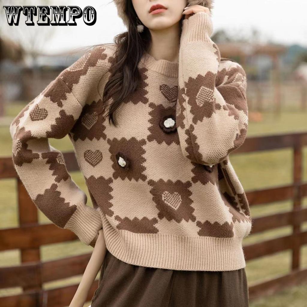 Heart-shaped Knitted Sweater for Women's Autumn and Winter Loose Checkerboard Checkerboard Pullover Sweater