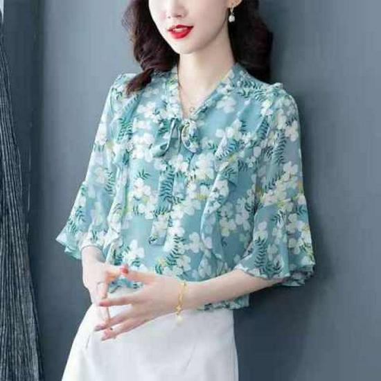 Women's Floral Chiffon Blouse with Bow - 2025 Summer Fashion, Flare Sleeves, Elegant Fairy Style.