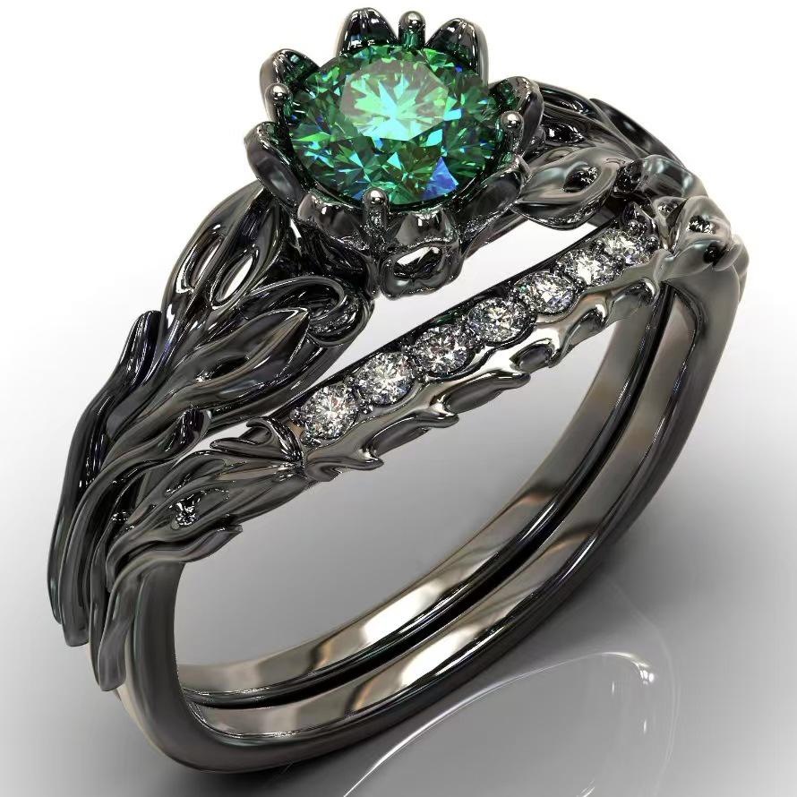 Sanjie SHEIN Emerald Inlaid Gun Black Wedding Rings for Women