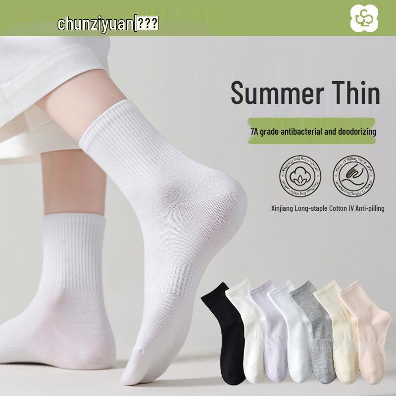 Zhuji Women's Summer Lightweight Pure Cotton Mid-Calf Socks, Anti-Odor, Sweat-Absorbent, White, 7A Class.