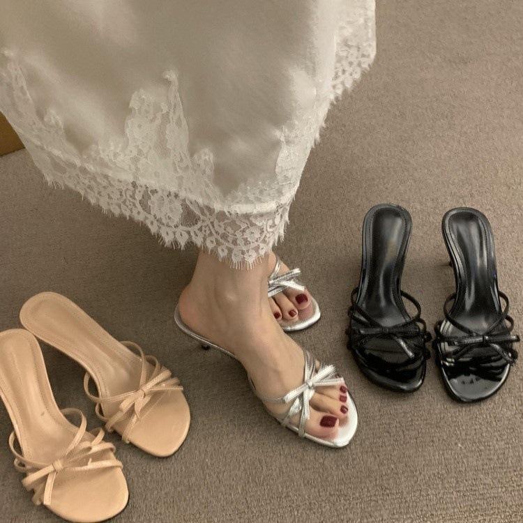 French Gentle Bow High-heeled Sandals Women's Summer Wear with Skirts, Beautiful Open-toed Casual Word with Cool Slippers