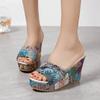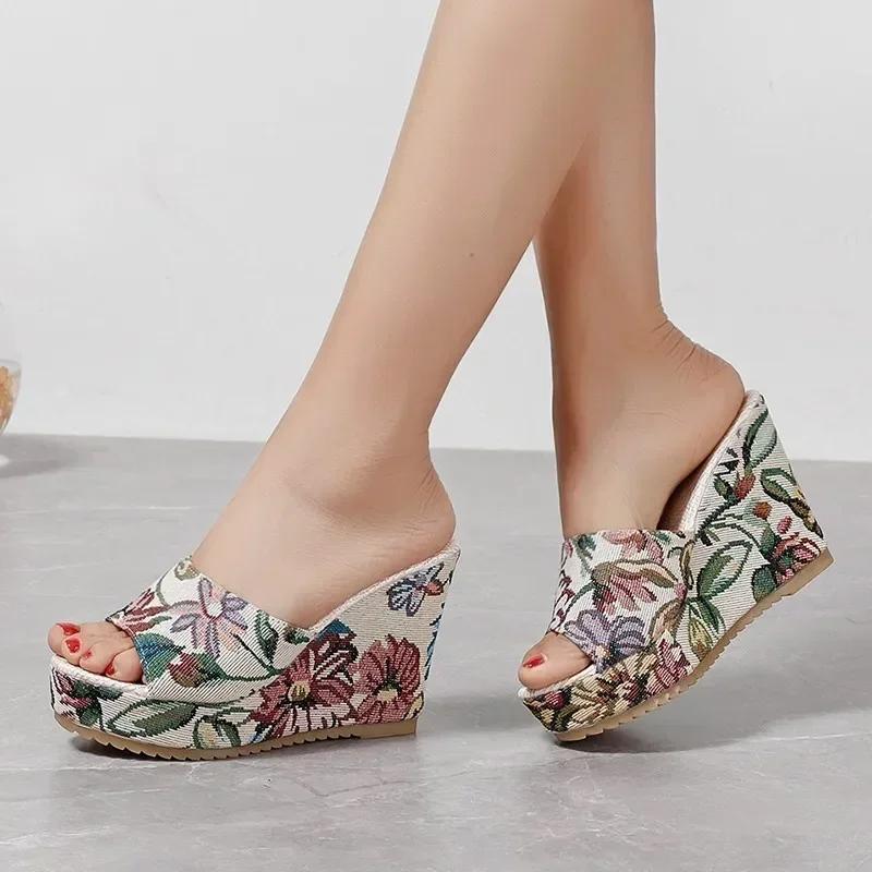 2025 Women Shoes Fashion Shoes Casual Flip Flops Summer Vintage Floral Print Peep Toe Wedge Slippers 35-42