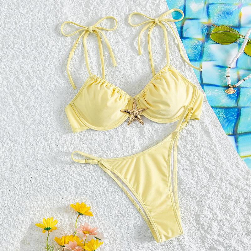 Light Yellow Metal Starfish Bikini Push Up Swimwear Micro Thong Sexy Swimsuit Women Lace-up Straps Bathing Suit Bikinis Set