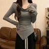 Irregular One-word Shoulder Solid Color Long-sleeved Shirt Women's Season Bottoming Shirt Slim-fit Spice Girl Waist Cotton Top